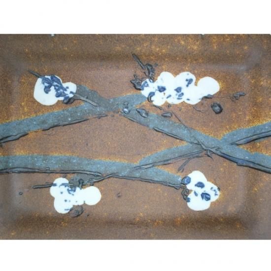 縁は波のような曲線で、表面に彫り込まれた枝に、グリーンやホワイトで花の様なペイントが施されています。